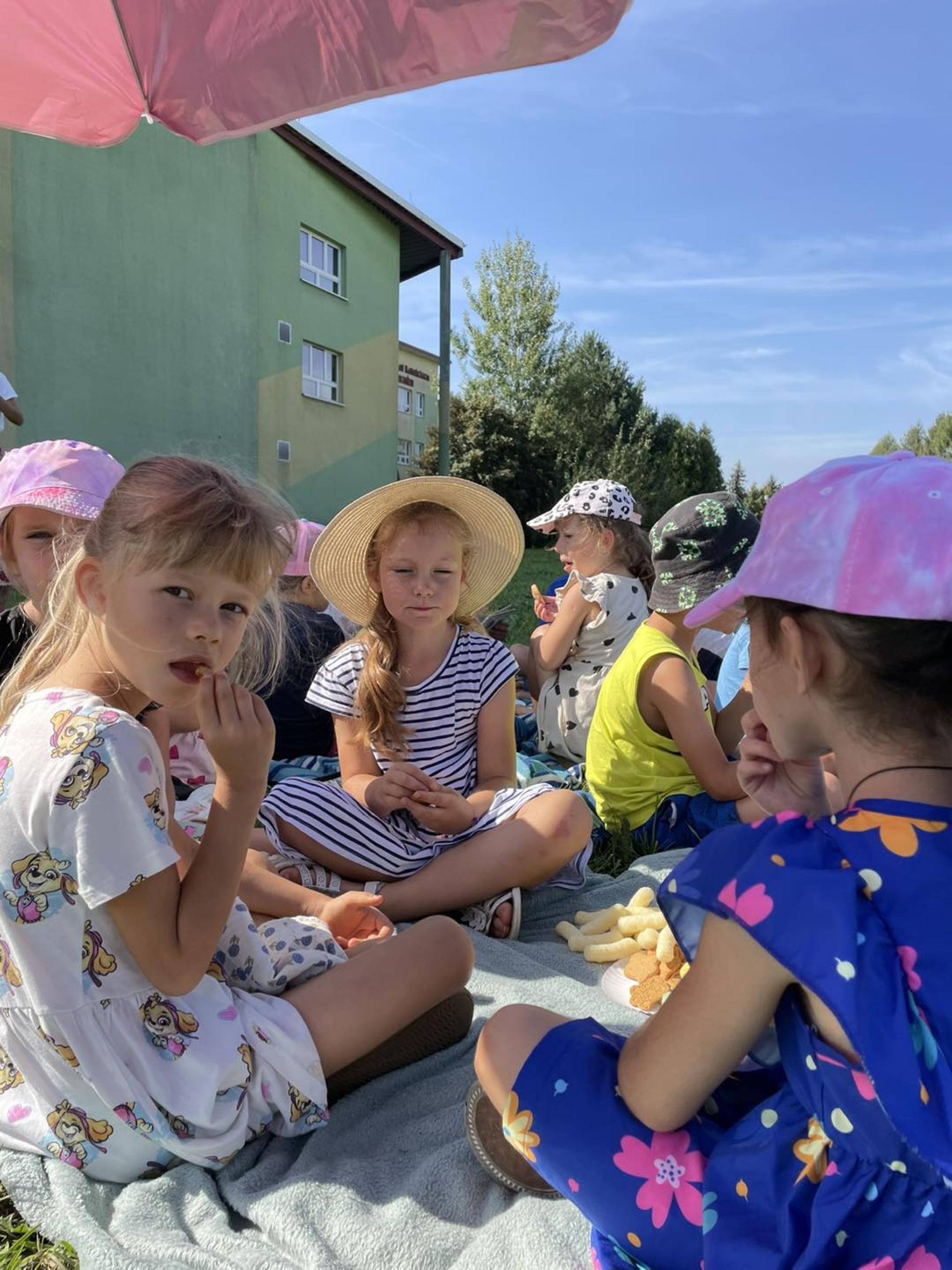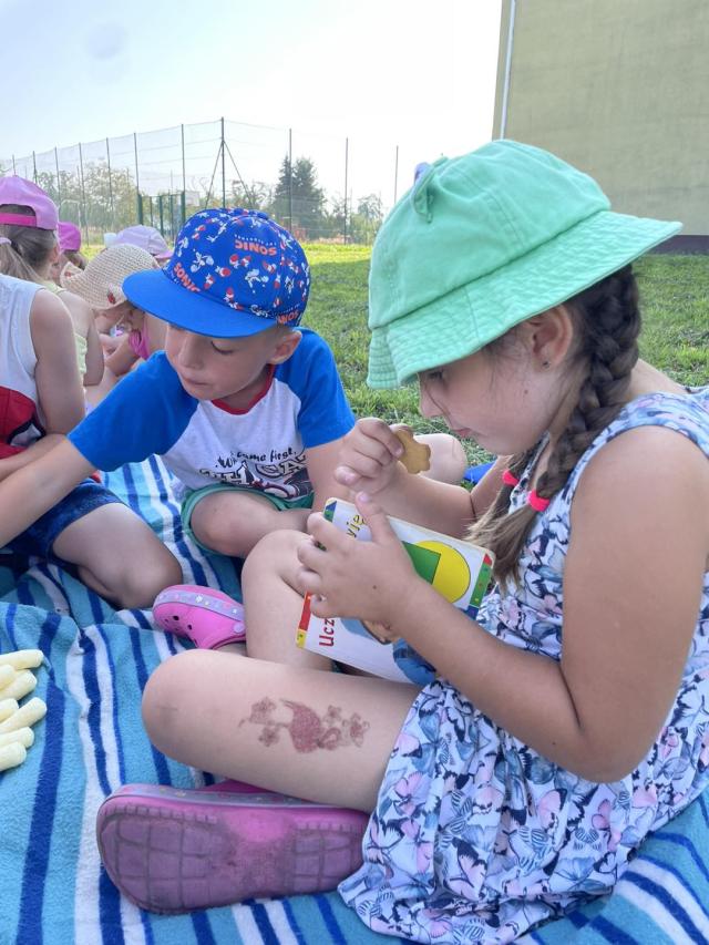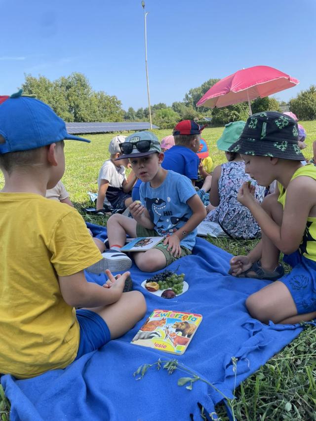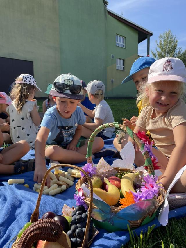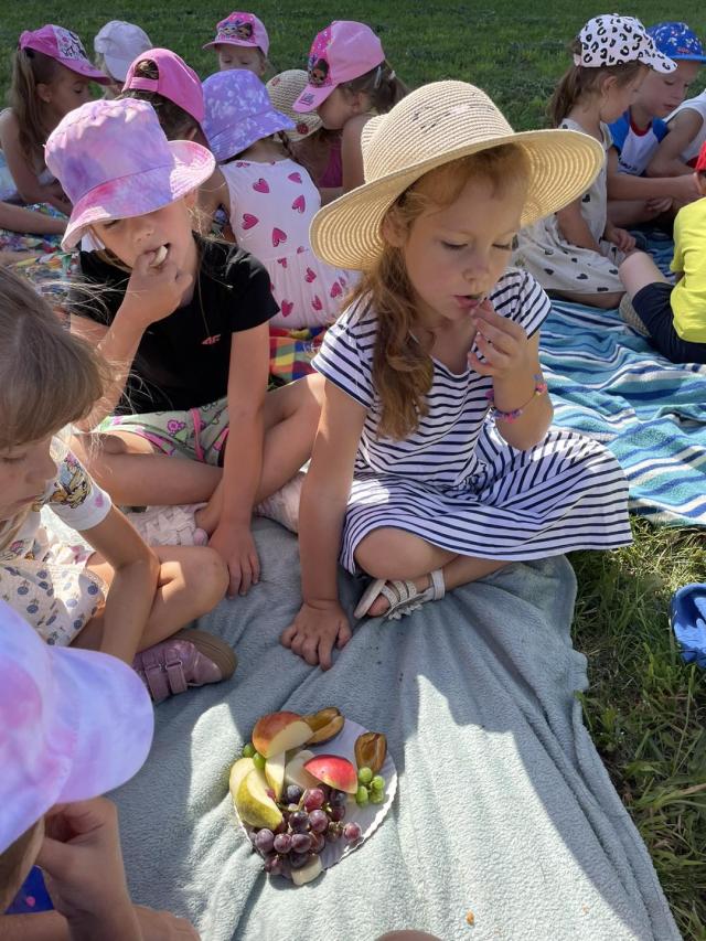 Ciocie z grupy biedronki zorganizowały piknik z okazji pożegnania wakacji. Przedszkolaki z radością zjadały przekąski, owoce i odpoczywały wśród natury.