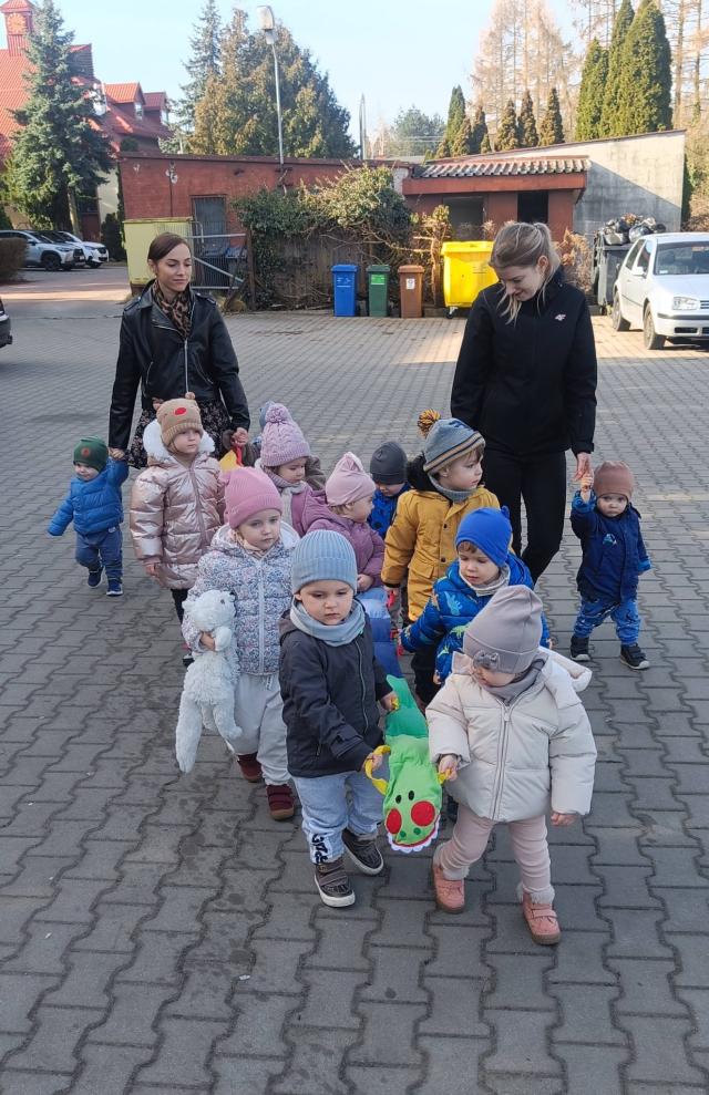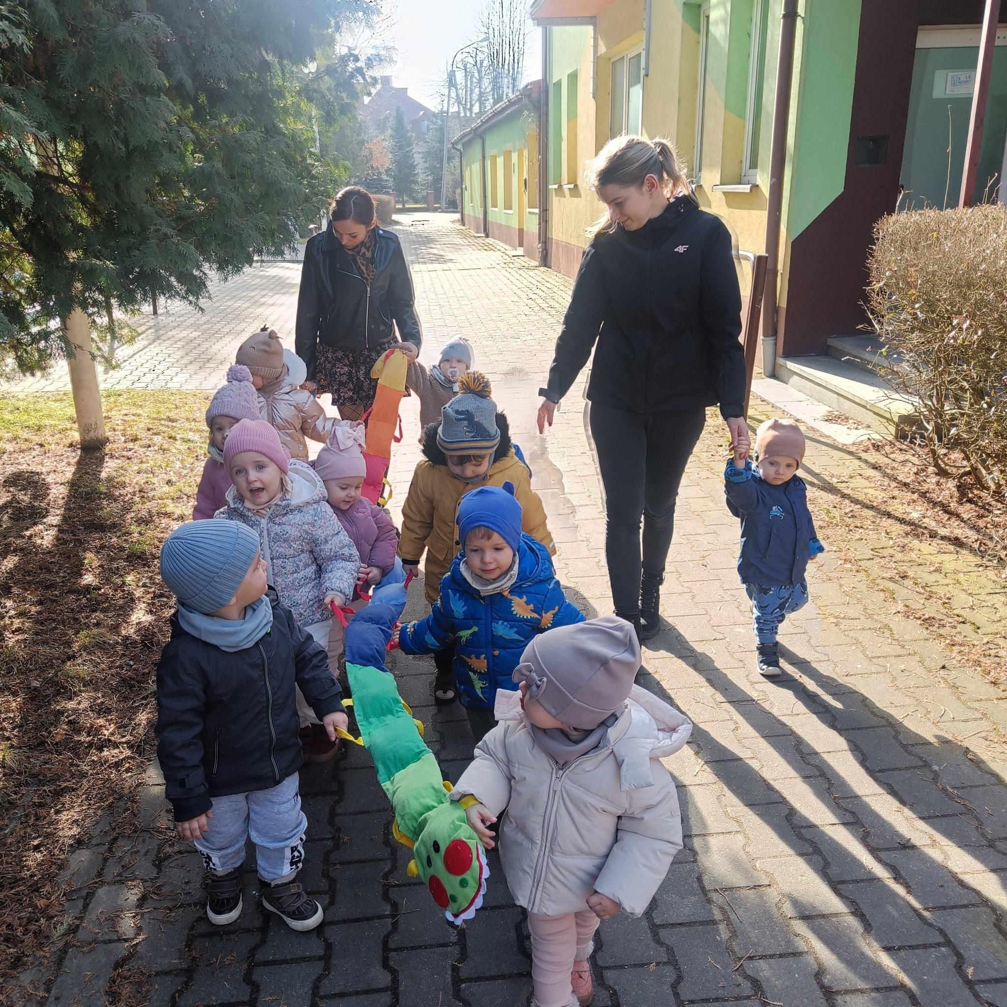 Maluchy podziwiały otaczającą nas przyrodę, powoli budzącą się do życia. Odwiedziły również pieska i kotka . Są to zwierzątka mieszkające na terenie naszego żłobka. W spacerze pomógł nam kolorowy przyjaciel wąż, który utrzymywał dzieci w parach. Było bardzo przyjemnie a dzieci ochoczo i z uśmiechem dreptały nóżkami.