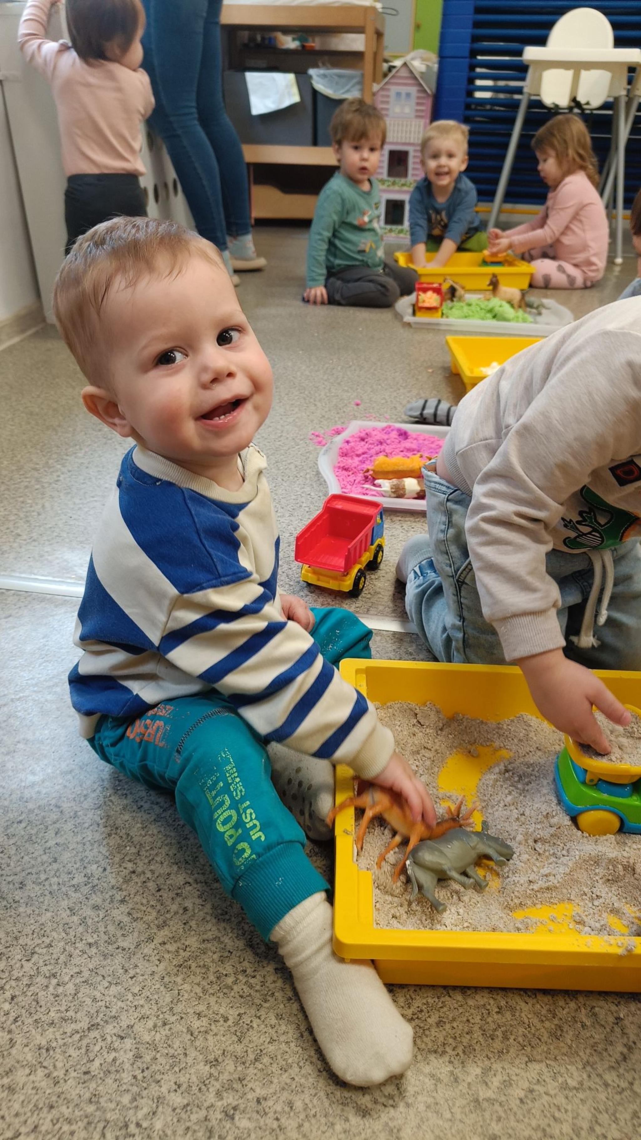Zabawy piaskiem kinetycznym i masą piankową. Żłobkowe sówki uczą się kreatywności, współpracy a przy tym świetnie się bawią.