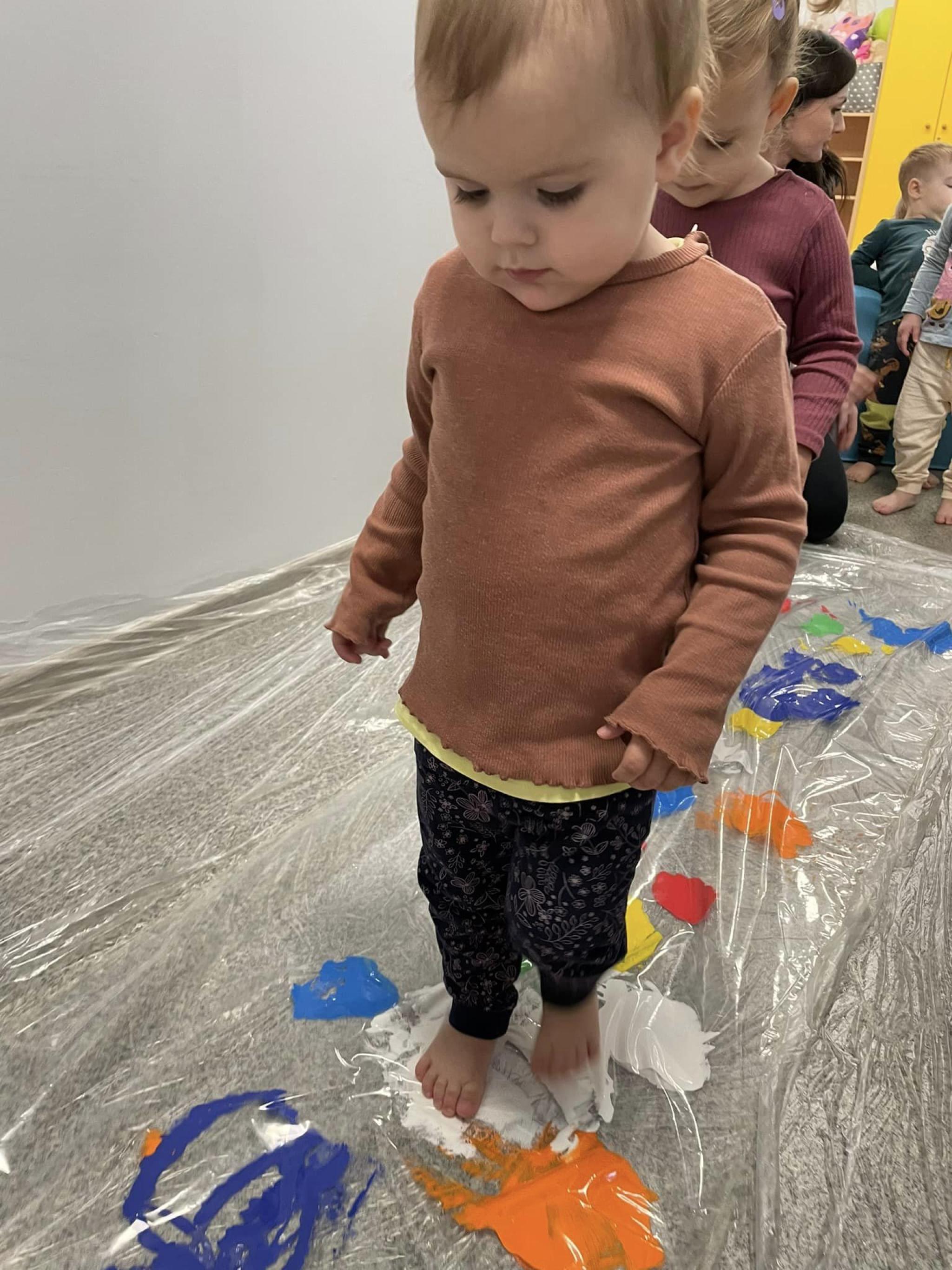 Dzieci miały okazję przyjrzeć się swoim stopom a podczas zabaw rozwijały zmysł równowagi, sprawność motoryczną i zmysł dotyku. Dzieci wykonały prace plastyczną swoimi stopami.