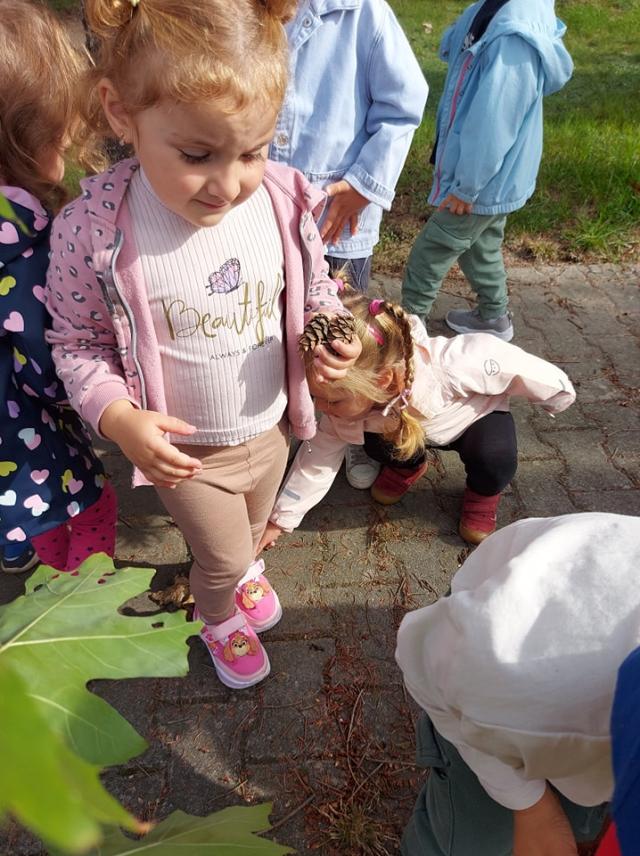 ,,Idzie lasem Pani Jesień, jarzębinę w koszu niesie.... " Grupa Motylki korzystając z pięknej pogody wyruszyła na spacer w poszukiwaniu skarbów jesieni.