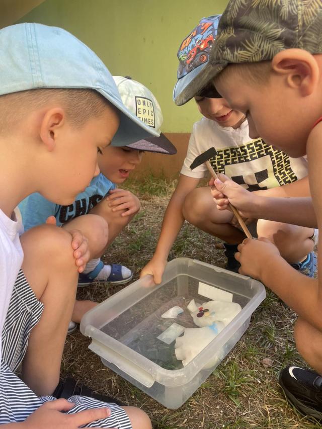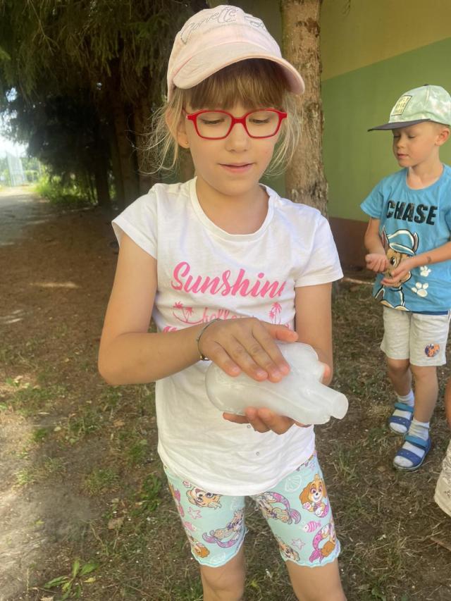 Dzieci z grupy biedronki próbowały wydobyć z lodu ukryte skarby. Lodowa zabawa wspaniale umiliła czas na słońcu.